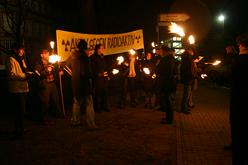 Mit einer 52 Kilometer langen Lichterkette protestierten Atomkraftgegner gegen die Atommüll-Lager Asse 2 und Schacht Konrad. Die Auftaktkundgebung begann am Kohlmarkt in Braunschweig.