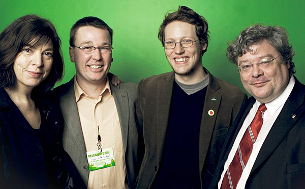 Das Foto zeigt Jan Philipp Albrecht bei der Bundesdelegiertenkonferenz in Dortmund mit dem Wolfenbütteler Delegierten und Direktkandidaten für die Bundestagswahl, Jürgen Selke-Witzel sowie mit den beiden Spitzenkandidaten für die Europawahl Rebecca Harms und Reinhard Bütikofer.