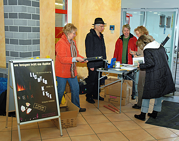 Einen Ansturm auf Fackeln für die Lichterkette von Braunschweig über die Asse bis zum Schacht Konrad in Salzgitter am 26.2. um 19 Uhr erlebten die Helferinnen und Helfer des Sickter Unterstützerkreises bei ihrem Verkaufsstand am Samstag: Allein in Sickte wurden bisher schon 530 Fackeln verkauft. Darüber hinaus wurden die beliebten Asse-"A"s erneut abgeräumt: Sämtliche großen Holz-"A"s waren ausverkauft, auch Aufkleber und Anstecker gab es zum Schluss keine mehr.