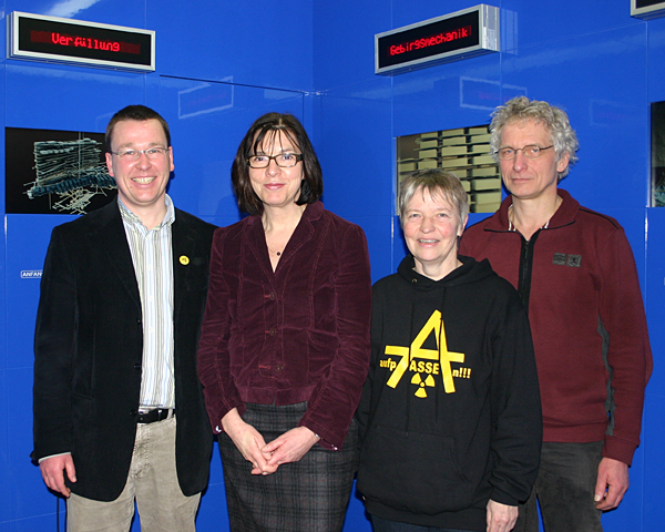 Rebecca Harms, die Spitzenkandidatin von Bündnis 90/Die Grünen für die Europawahl, zeigte sich bei einem Besuch des neuen Informationsstelle Asse in Remlingen angenehm überrascht von der nun dargestellten Offenheit und Transparenz über die Vorgänge im Atommülllager Asse II. 1996 war ihr noch von Vertretern des Helmholtz-Institutes ein reibungsloser und störungsfreier Ablauf versichert worden. Dies habe sich als große Täuschung heraus gestellt. Dagegen gingen Stephan Pinkert und Florian Emrich vom Bundesamt für Strahlenschutz ehrlich auf die derzeitigen Probleme ein, die die tägliche Arbeit unter Tage vor immer neue Herausforderungen stellten. Rebecca Harms bedankte sich bei allen Mitarbeiterinnen und Mitarbeitern vor Ort für ihre engagierte Arbeit. Sie betonte, dass die dubiosen Vorgänge um die Einlagerung von Atommüll in Asse II, Morsleben und Schacht Konrad würden grundsätzliche Fragen nach der Verantwortlichkeit wie auch nach der nicht rückholbaren Endlagerung aufwerfen. Dem stimmten die beiden Direktkandidaten für den Deutschen Bundestag, Helmut Blöcker aus Braunschweig und Jürgen Selke-Witzel aus Wolfenbüttel, vorbehaltlos zu. Sie forderten als Konsequenz eine neue Debatte über mögliche Endlagerstandorte in Deutschland.