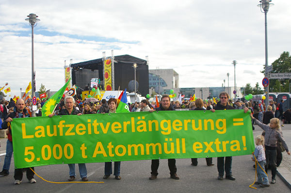 100.000 Menschen kamen zur Großdemonstration nach Berlin und umzingelten das Regierungsviertel. Auch aus dem Landkreis Wolfenbüttel waren einige Mitglieder des Kreisverbands von Bündnis 90/Die Grünen nach Berlin gereist, um gegen die Energiepolitik der Bundesregierung zu protestieren. Lutz Seifert vom Ortsverband Elm – Asse - Fallstein sagt dazu: „Das Energiekonzept der Bundesregierung schafft es nicht, eine Begründung für eine Laufzeitverlängerung der Atomkraftwerke herbeizurechnen. Weder die Strompreise noch Versorgungssicherheit und Klimaschutz werden durch eine Laufzeitverlängerung wesentlich beeinflusst. Dafür entstehen 5000 t Atommüll zusätzlich und für den Atommüll gibt es weltweit kein sicheres Endlager.“