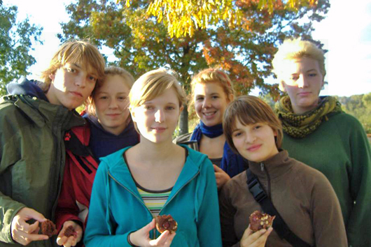 Den Nachmittag verbrachten wir mit einem Rundgang durchs Dorf, wobei wir besonders die tierischen Dorfbewohner ins Herz schlossen. Bevor Ulf Lahmann seinen kleinen Vortrag für uns hielt, fuhren 5 von uns mit ihm auf dem Traktor zu seiner Schafweide und halfen beim Zaun-Abbau. Sein Gespräch mit uns begann er danach mit einer schwierigen Frage: "Was ist die wichtigste Frage für die Zukunft der Menschheit?" Er erklärte uns, dass sein Hof der Versuch einer Antwort sei. Außerdem las er uns selbst geschriebene Gedichte vor, die zum Nachdenken anregen sollten (was sie auch taten). Darauf folgte eine Hofführung, bei der angenehme Kontakte zu Schweinen, Hühnern, Fischen und Käfern geknüpft wurden. Den Rest des Abends verbrachten wir mit Essen und auf JPA warten, der dann tatsächlich auch noch auftauchte. Er berichtete über das Leben in Kommunen, speziell der Kommune Niederkaufungen. Nach diesem Bericht folgte eine Leserunde mit dem wunderschönen Buch "Ronja Räubertochter", die durch den Genuss von biologischem Wein noch verbessert wurde. Von der DVD, die wir danach guckten, bekam kaum jemand etwas mit, da der Großteil nach 10 Minuten friedlich schlummerte.